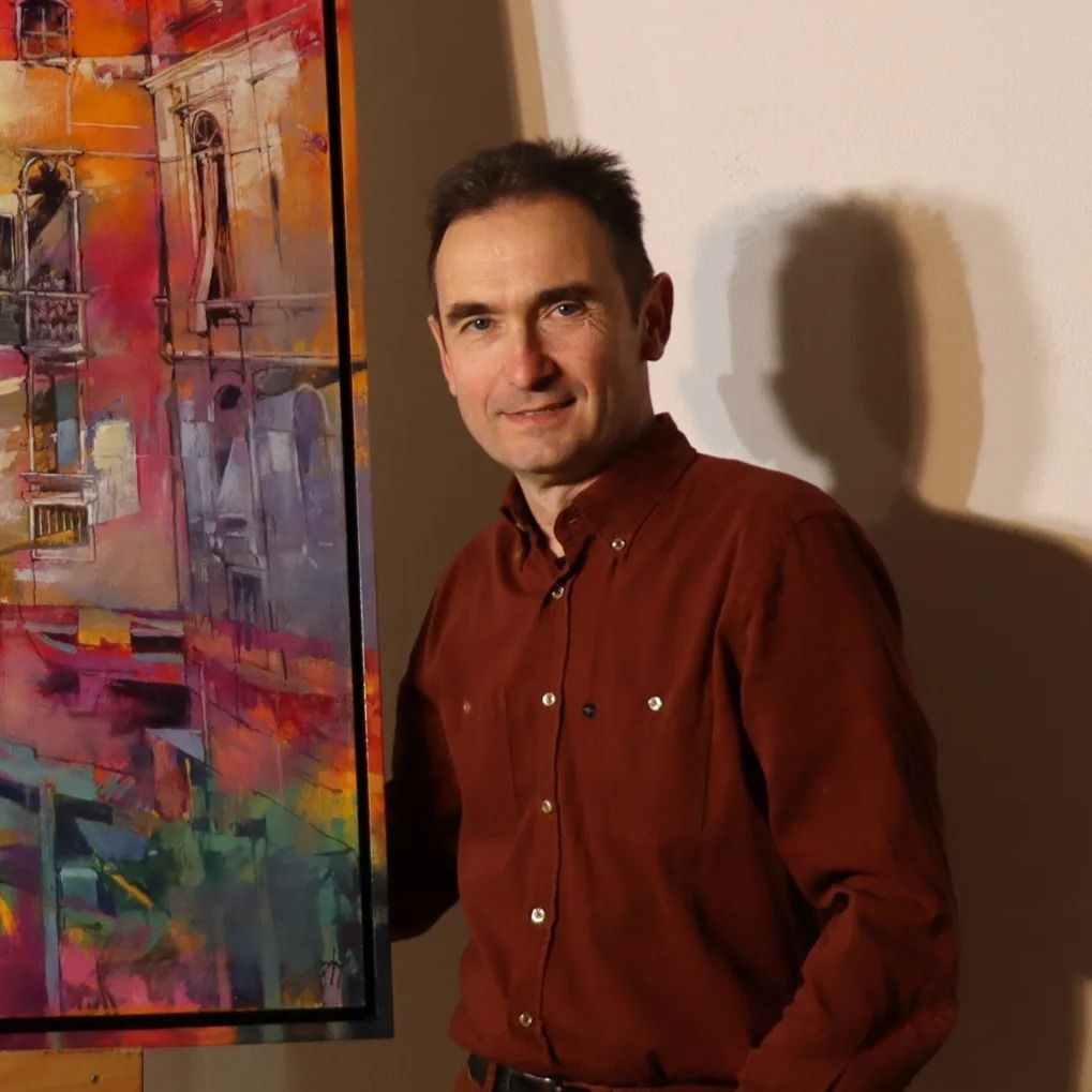 1963 年出生義大利都靈,12 歲舉家遷居義大利科奈爾,這裡一直延綿至阿爾卑斯山的明媚風光,滿足了他作畫的想像空間;在 1988 年 Marco Lattes 大師個別指導下開始作畫。