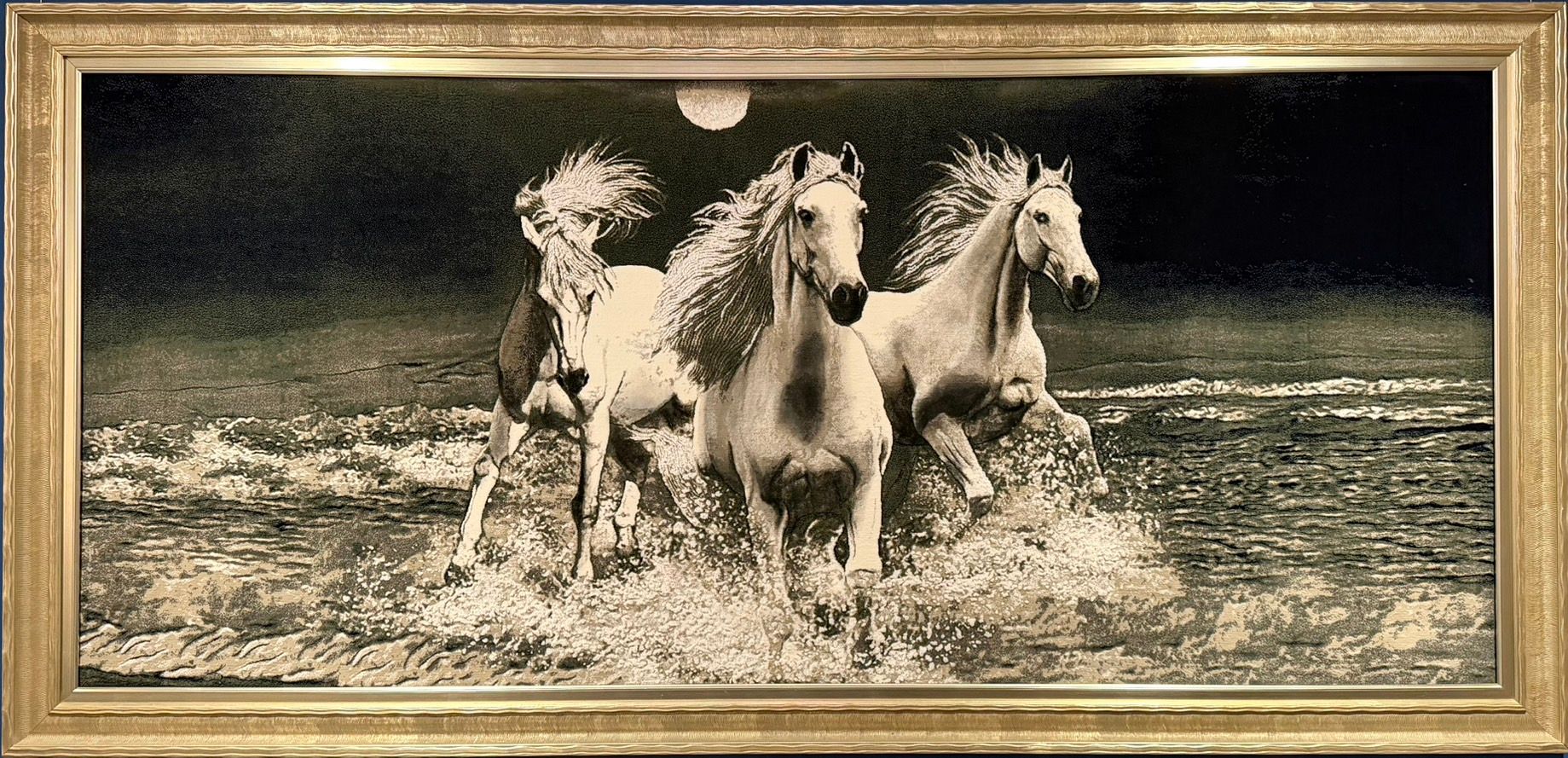 三匹白馬踏水而奔,月光映照水面,濺起飛花,盡顯生命澎湃的動能。白馬化作成功、前行與純淨智慧的象徵,明月與幽靜色彩平衡急促奔騰,呈現「動中有定」的禪意。掛毯經緯交織,賦予筆觸溫度,傳遞突破障礙、馬到成功、圓滿平安的祝福與力量。