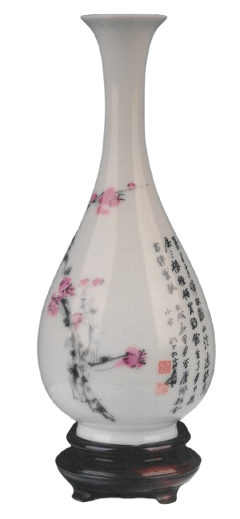 此瓷瓶形制典雅,曲線流轉如水,釉色瑩白溫潤。瓶身一側粉彩紅梅,枝幹蒼勁、寒香暗度;另一側題張大千七言絕句:「萬里還歸故國山,溪邊結得屋三椽。種梅買鶴餘生了,月下花前伴鶴眠」,詩意清遠。畫與詩相映,寄託其晚年寓居摩耶精舍時,對故土的深切思念與歸隱山林的心願。器物之中,文人風骨與孤高情懷悄然凝聚,靜靜流淌於時光之間。