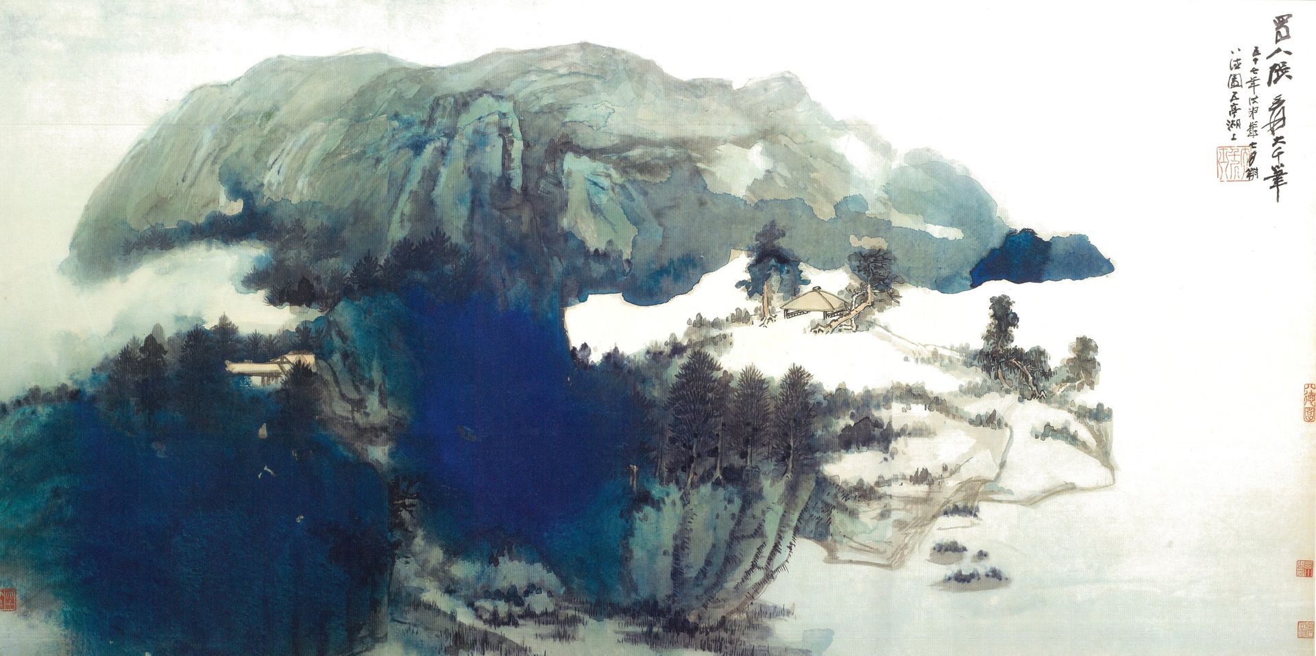 張大千晚年鉅作《闊浦晴嵐》,作於巴西八德園五亭湖畔,以潑墨潑彩寫就胸中山河。畫家揮灑石青、石綠,層層積色,半抽象的山巒在濃墨與留白間起伏生煙,如江南晴嵐,迷離而悠遠。前景房舍、樹木以細筆點染,使抽象氣勢中暗藏可遊可居的現實線索。