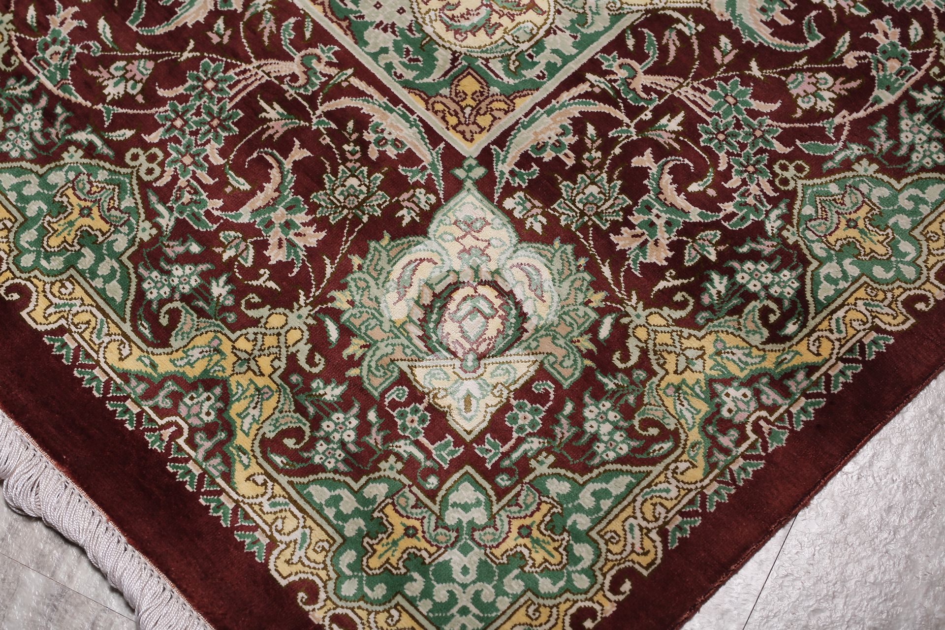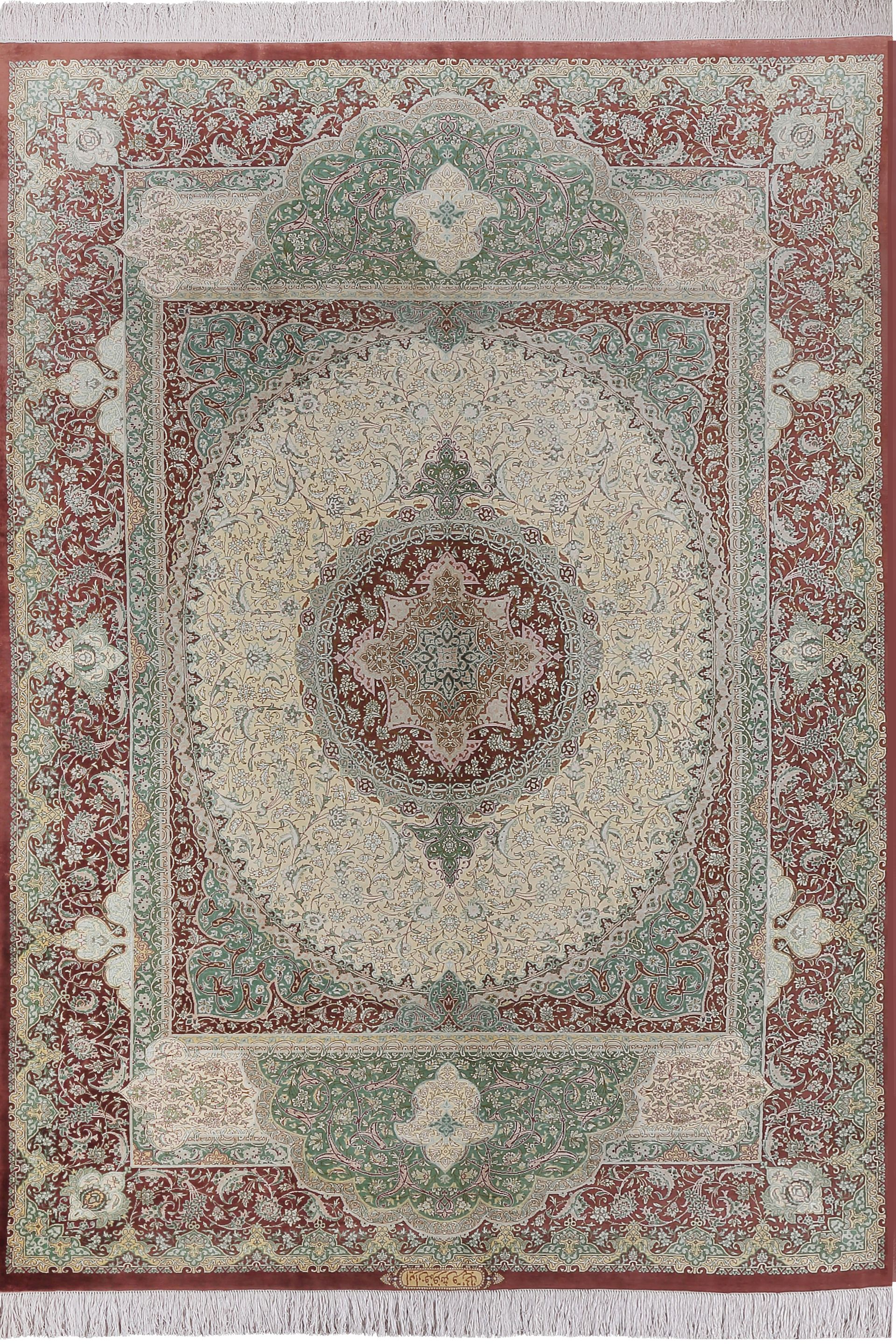 這張來自庫姆的手工絲毯,以象牙白為底,搭配細緻花卉與藤蔓圖騰,展現典型波斯風情。中央圖案對稱綻放,從中心向四周延展,構築出優雅平衡的視覺節奏。