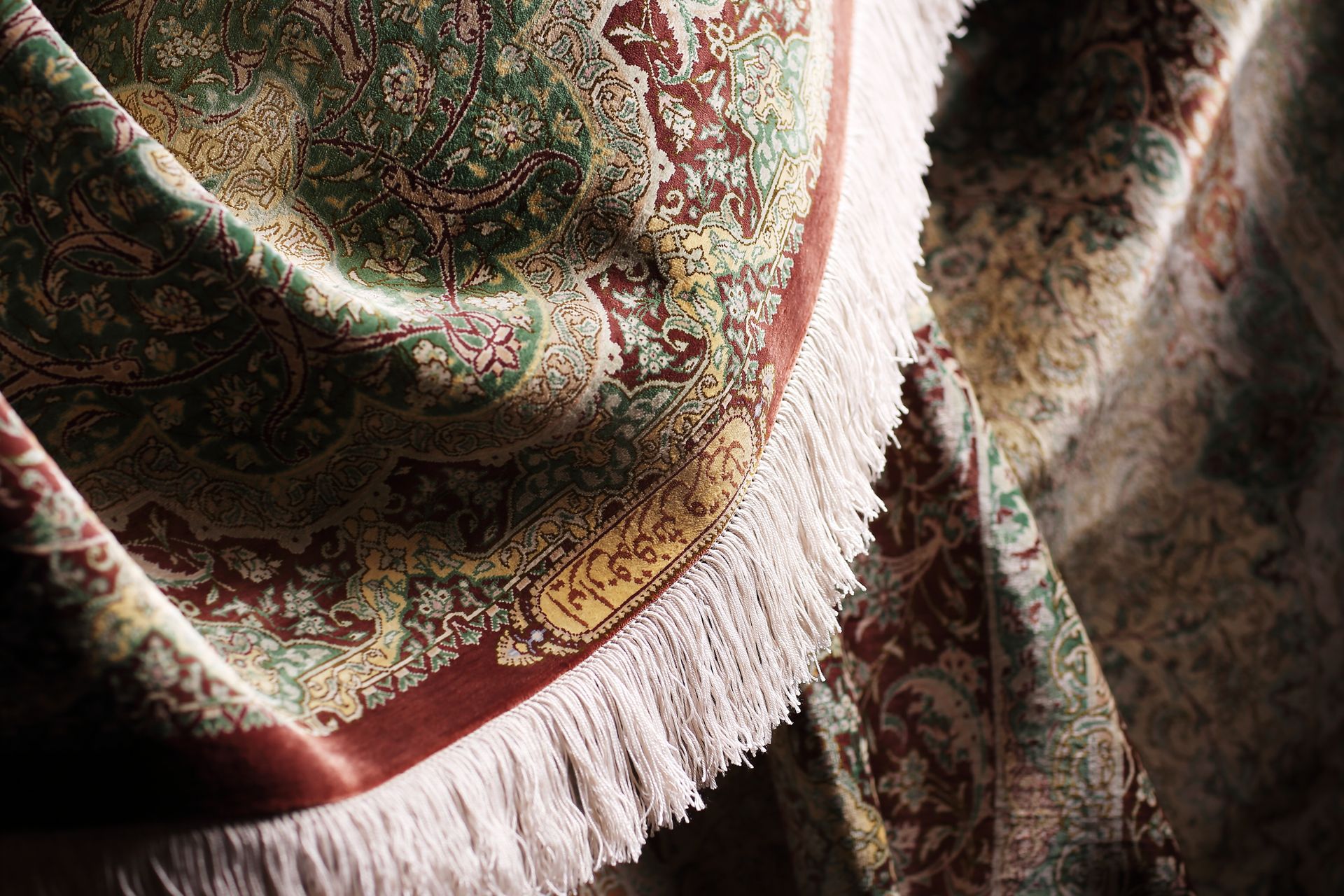 色彩以柔和的翡翠綠與棕色為主,佐以金色與米色點綴,氛圍清雅寧靜。邊框圖紋與中央設計巧妙呼應,使整體呈現如一座古典花園,靜靜鋪展於地。
