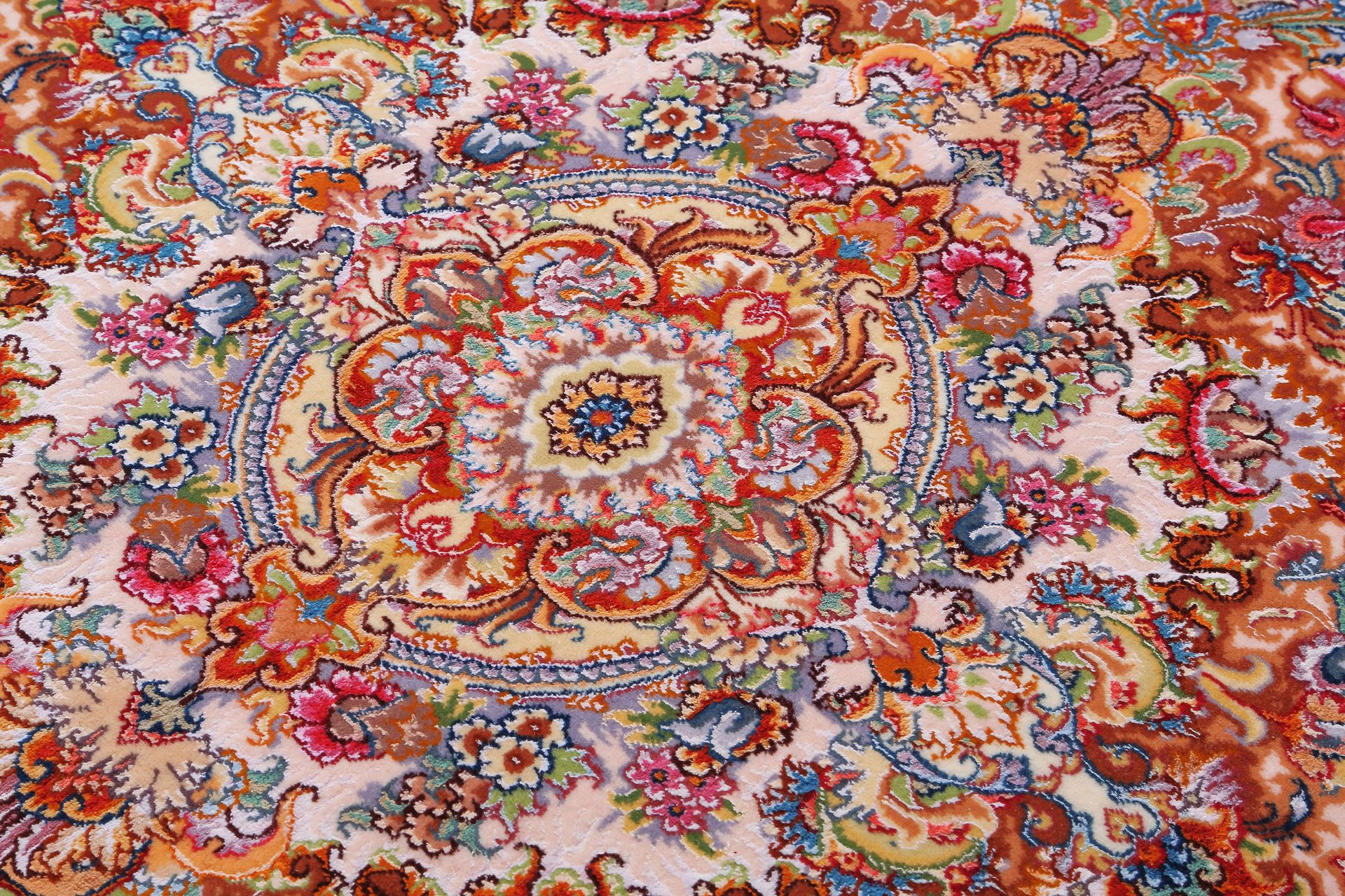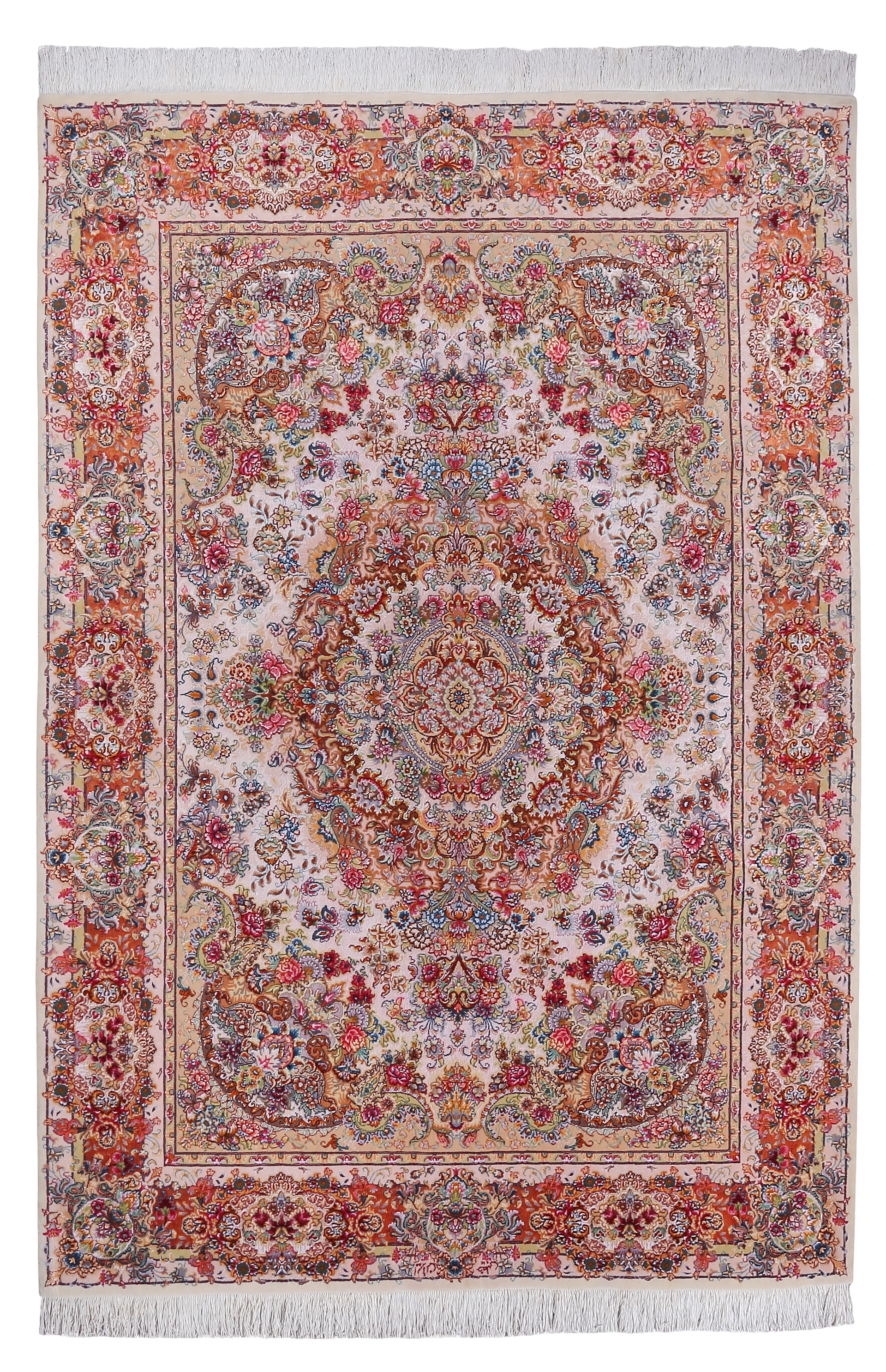 這張來自伊朗大布里茲(Tabriz)的手工地毯,以象牙白為底,中央以精緻菱形花卉為主圖,四周環繞繁複的藤蔓與花卉圖騰,展現濃厚的波斯風格。圖案細膩對稱,視覺層層展開,猶如織出的花園夢境。