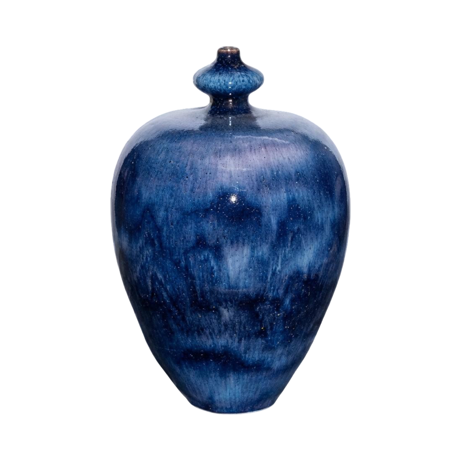 這件作品為台灣陶藝家郭明慶「大地之美」系列代表作之一,凝聚他對山川天地的深情凝望。以手拉坯塑形,圓潤器身如承載大地氣息;釉色在火焰中流轉、噴灑交融,化作水墨般層層鋪展的意象。黑、白、藍彼此暈染,如群山起伏、雲霧迴盪,又似星河映照蒼穹,展現自然古樸而深邃的生命律動。其晶瑩釉面蘊藏變化萬千的光澤,既見匠心火候,亦顯現代藝術的開闊氣象,為典藏所珍,靜靜訴說泥與火淬鍊而生的壯麗詩篇。