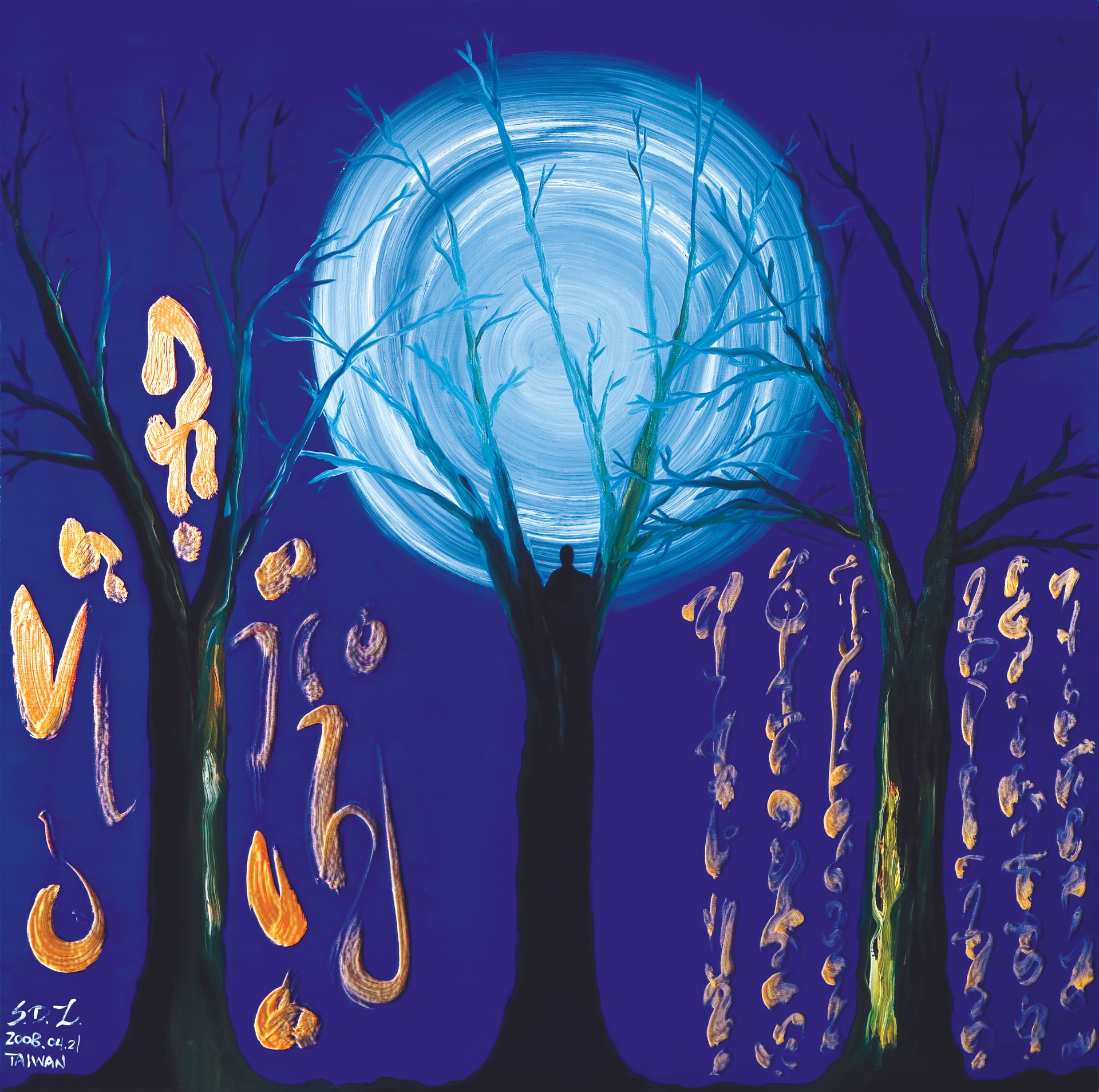 深邃電光藍如夜幕,一輪碩月懸於蒼勁樹梢,營造空靈禪境。右側金燦圖騰寓意「上品華嚴心法」,左側象徵「動禪」,中央修行者靜坐樹下,承觀音菩薩觀月法門。李教授以獨創圖騰語彙,將三昧禪境化為色彩與線條,令觀者於律動中感受內在光明圓滿,體悟宇宙和諧與心靈深遠的平靜。