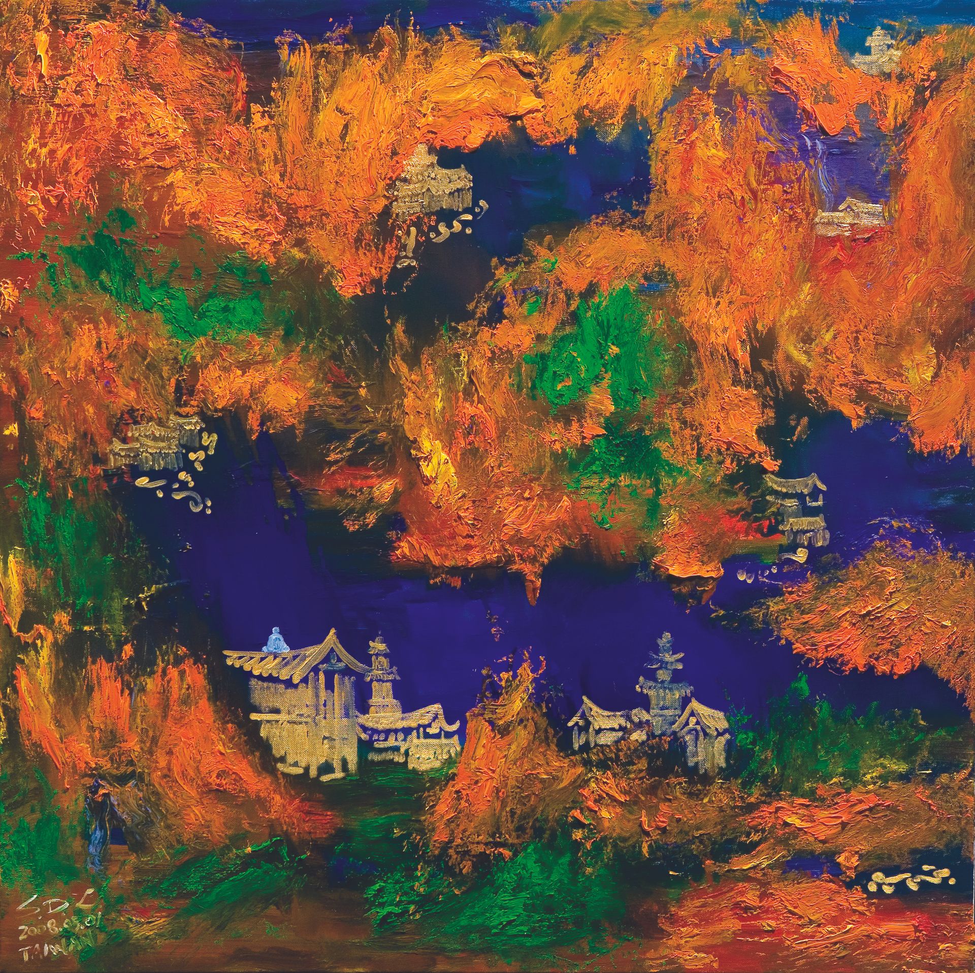 取自唐代「詩佛」王維名句,濃烈藍、金、綠交織,勾勒如夢山水。李教授以圖騰語彙,將水盡之處化作雲霧生機,寓逆境中心境轉明,得見禪意豁然。隱現建築與修行者,象徵隨遇而安、心游虛空。掛毯經緯交織,傳遞自然生生不息的力量,引觀者領略淡泊、自在、廣闊的人生境界。
