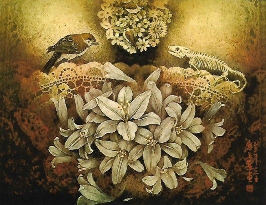 《對話》以膠彩鋪陳一場靜默而深遠的相遇:盛放的百合潔白如光,麻雀輕棲其側,而蜥蜴的骨骸靜伏一隅。生與逝在畫面中並置,不喧不語,卻彼此凝望。廖美蘭融合寫實造型與筆墨韻致,以細膩色彩牽引時間的流動,使生命的脆弱與恆常在同一瞬間交會,化為一則關於存在、循環與靜思的詩性低語。