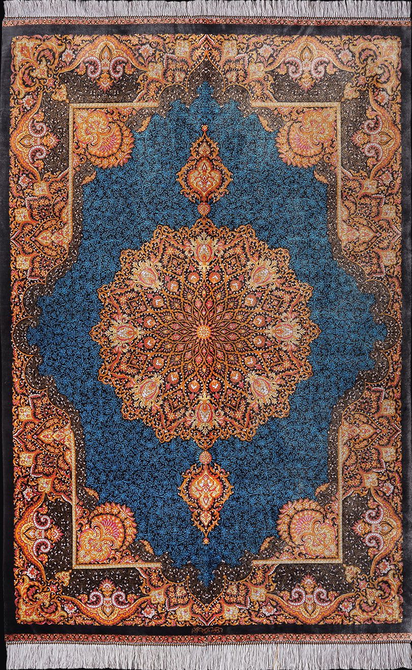 這張100 x 160 cm 的手工絲毯,出自伊朗 Qom,由地毯大師 Mr. Moosavi 親織,耗時一年半方完成。以百分之百純絲為材,密度極高,光澤細膩。中心圖騰為經典「花之星盤」設計,由內而外綻放放射狀花瓣,如星辰於夜空中齊聚,象徵宇宙秩序與生命循環。