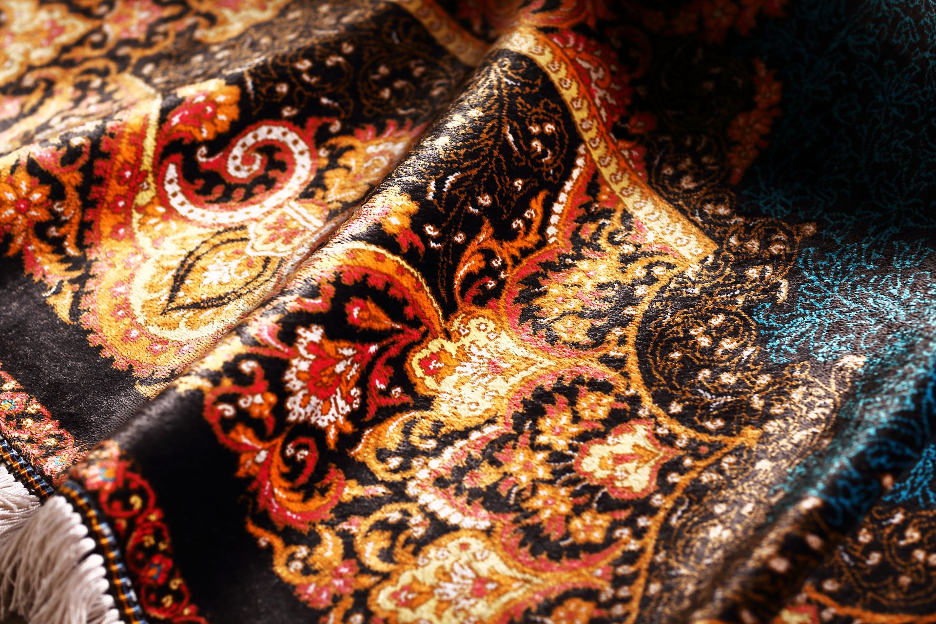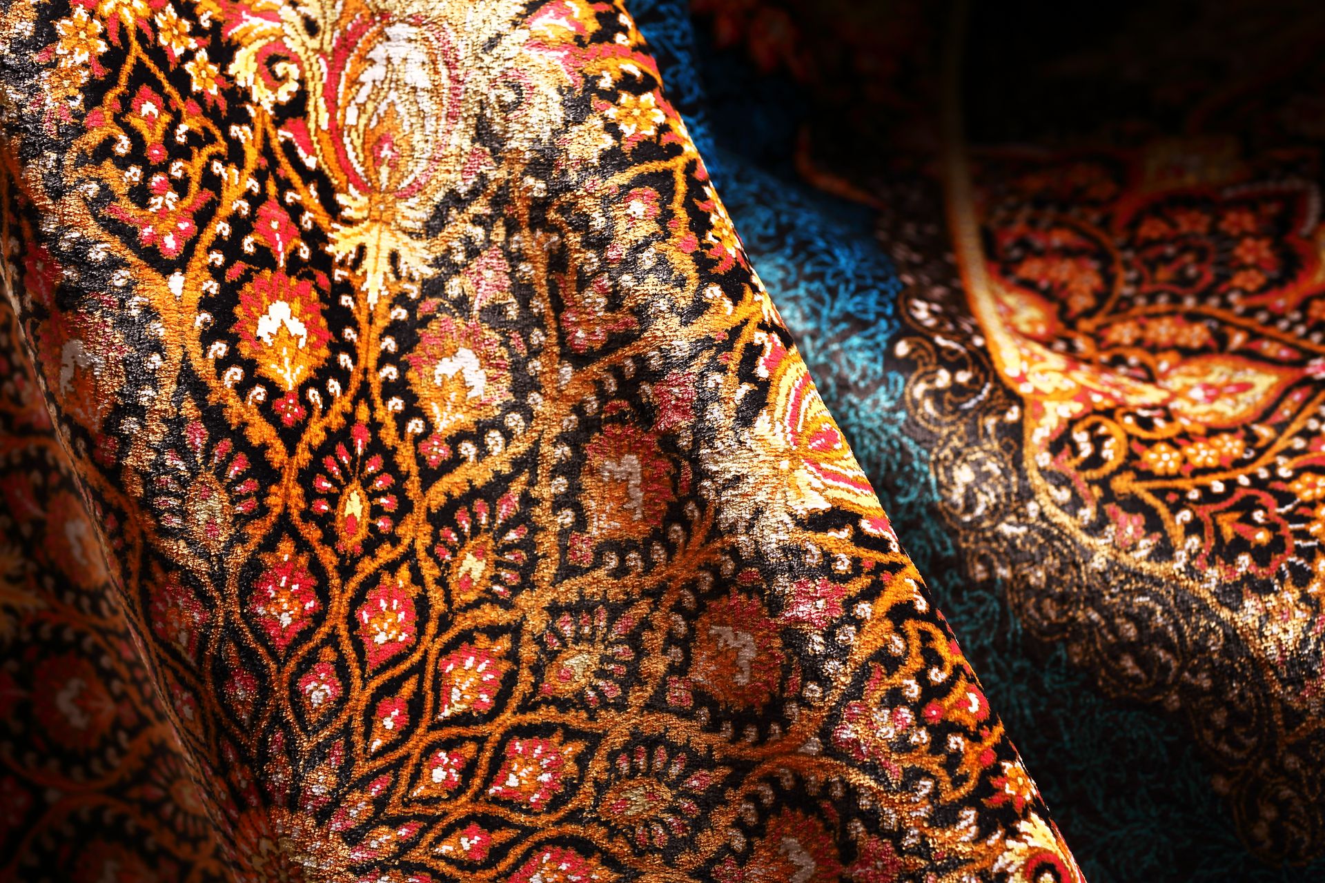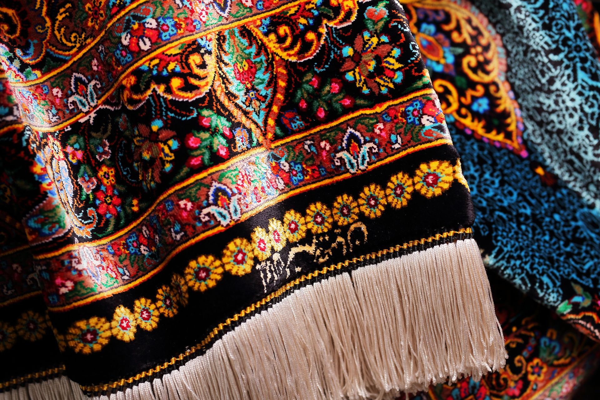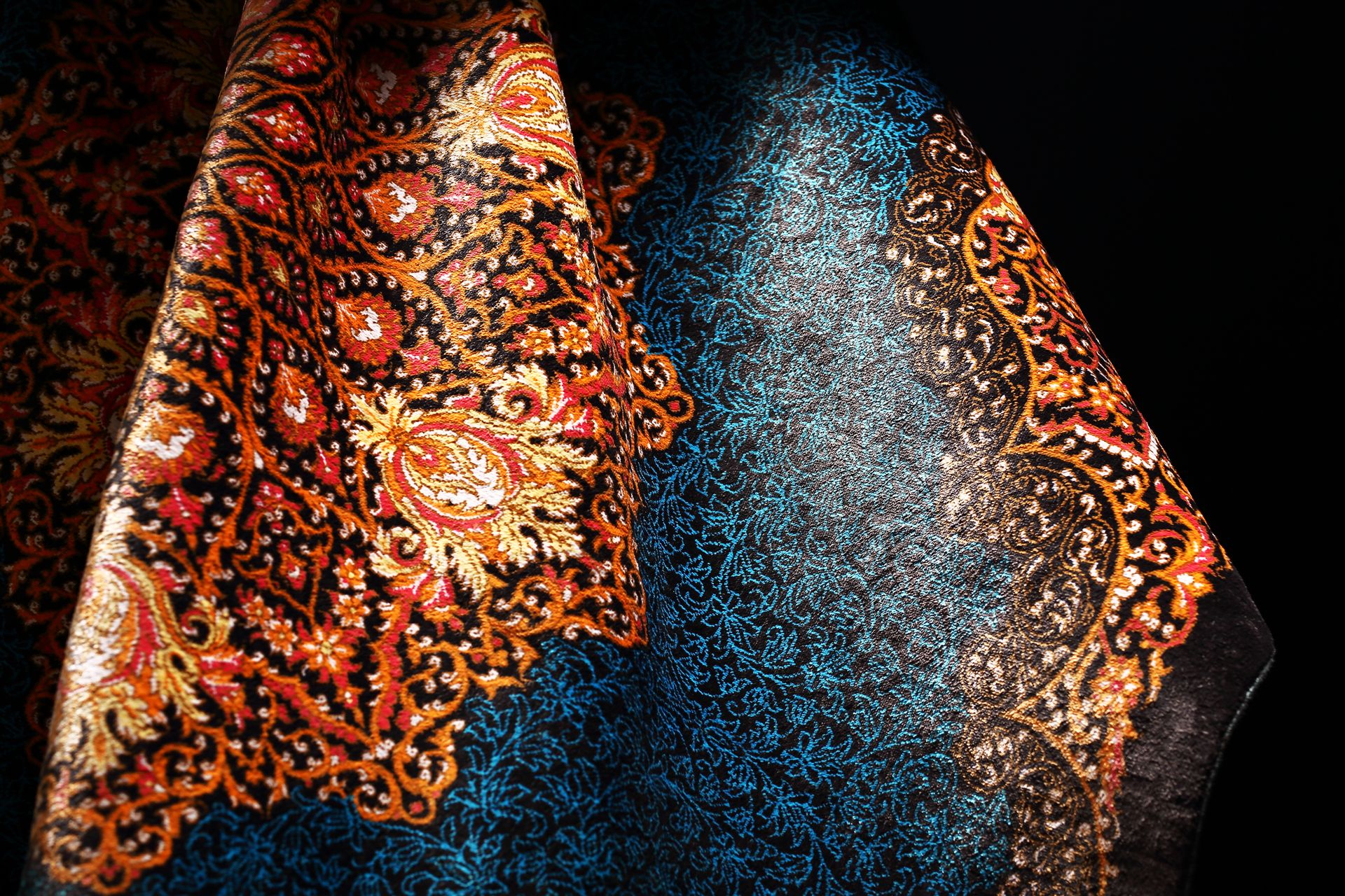 主色採深夜藍,層層堆疊深淺藍織紋,宛如午夜星河;花瓣與邊框則以金橘、石榴紅與乳白交錯,宛若花火盛放。四周圖騰細節華麗繁複,代表著波斯傳統的「花園理想」:一處靜謐而永恆的心靈之境。