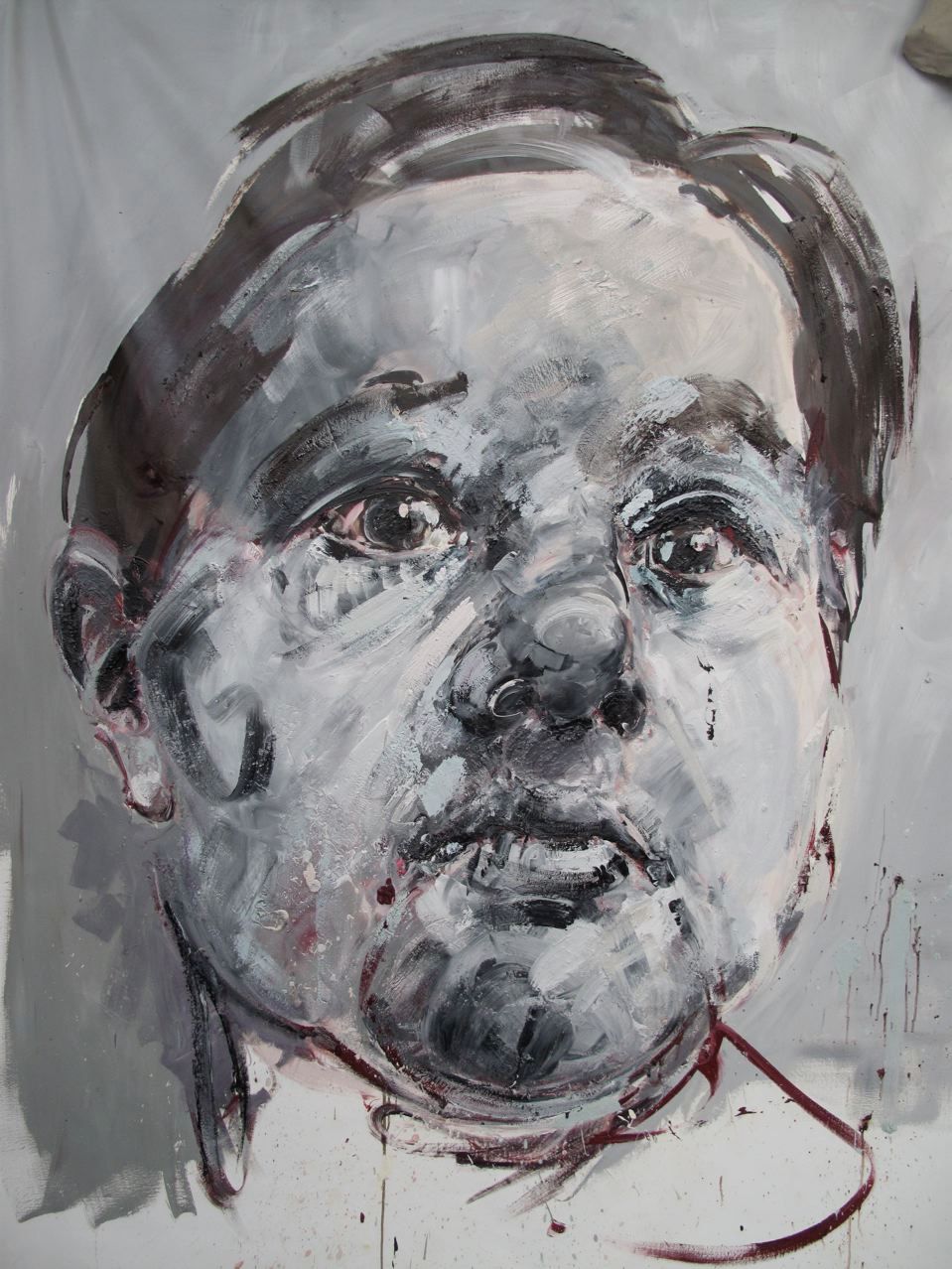 這張肖像並不試圖修飾或美化觀看的對象,而是以直接而誠實的方式,呈現一種真實存在的重量。灰白與暗色調在畫面中層層堆疊,筆觸粗獷而克制,面容在反覆塗抹與刮除之間逐漸浮現,既脆弱又堅定,無法被輕易忽視。