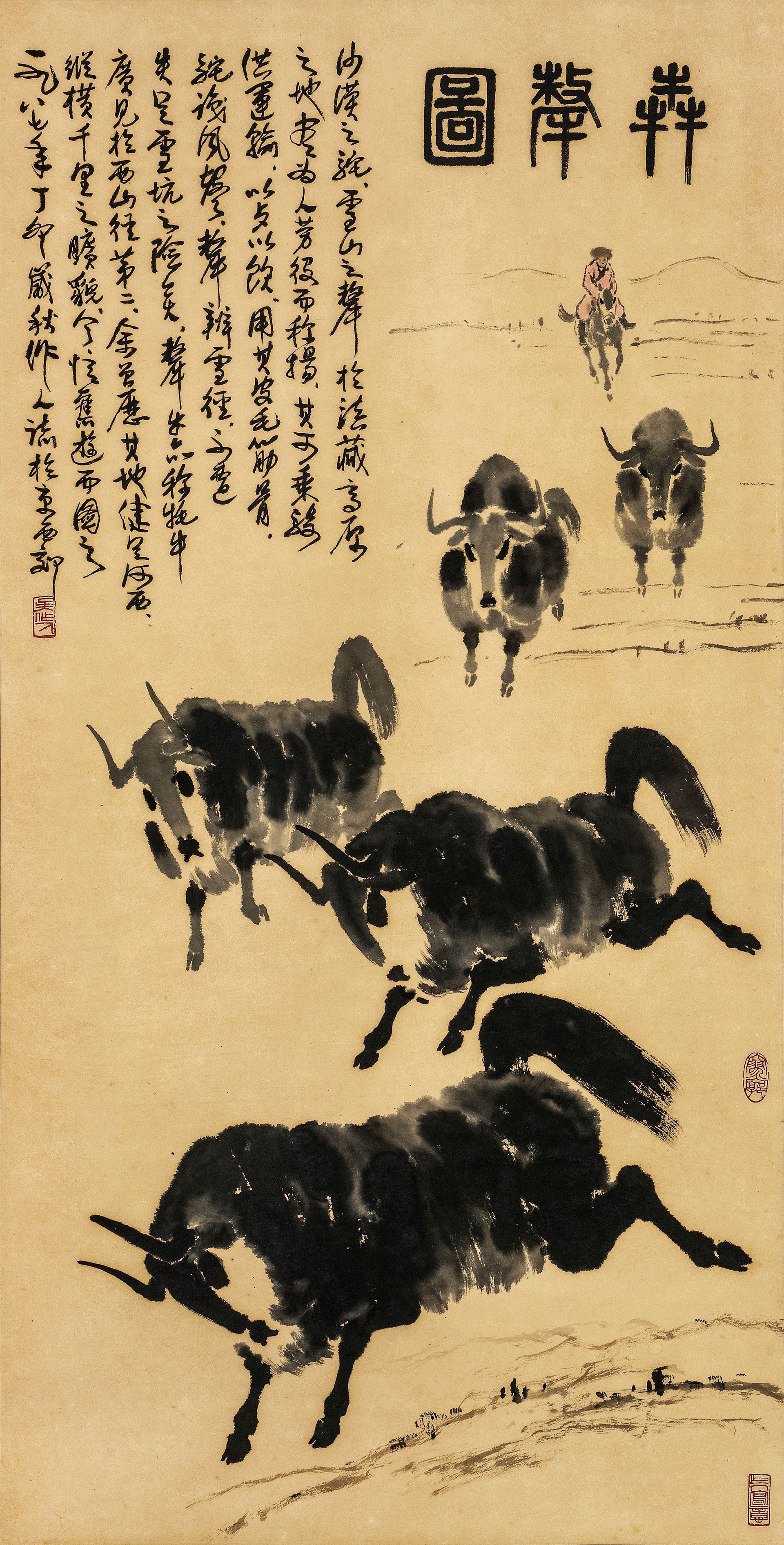 《犇犛圖》以簡練而富有張力的筆墨,描繪高原犛牛奔行的雄健姿態。吳作人運用濃淡有致的水墨層次,捕捉犛牛厚重而沉穩的生命力量,畫面動勢強烈卻不失節奏感。作品不僅呈現自然生靈的原始野性,也象徵高原民族堅韌不屈的精神氣質,展現畫家融貫中西、以寫意精神詮釋現實的藝術境界。